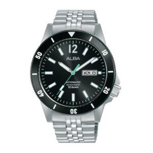 Like many Alba mechanical pieces, this model uses the reliable Y676 automatic movement, a dependable calibre that winds itself with wrist movement and displays hours, minutes, seconds, plus date and day functions. The two-way rotating bezel and luminescent hands add utility without overstating the watch’s purpose.
